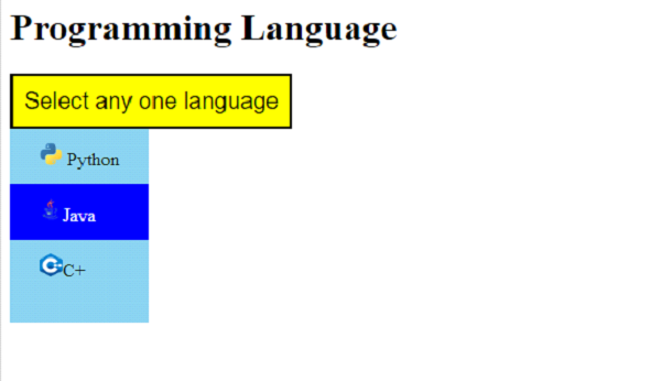 在上面的 div dropText 中,所有其他選擇項都放置有單獨的影像。dropText div 的樣式為。這也設定了選擇項的背景色,即淺藍色 −