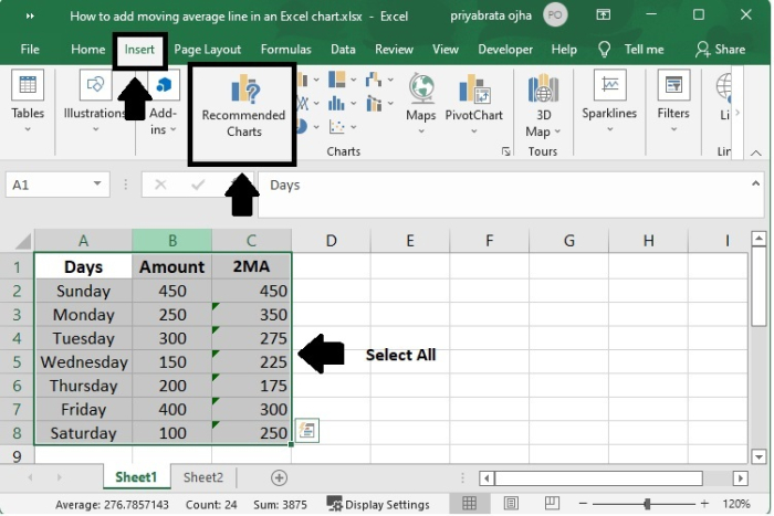 選擇資料來源中的資料,確保包含“平均值”列 (A1:C8)。