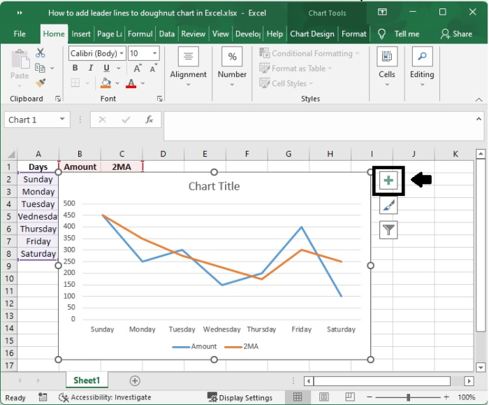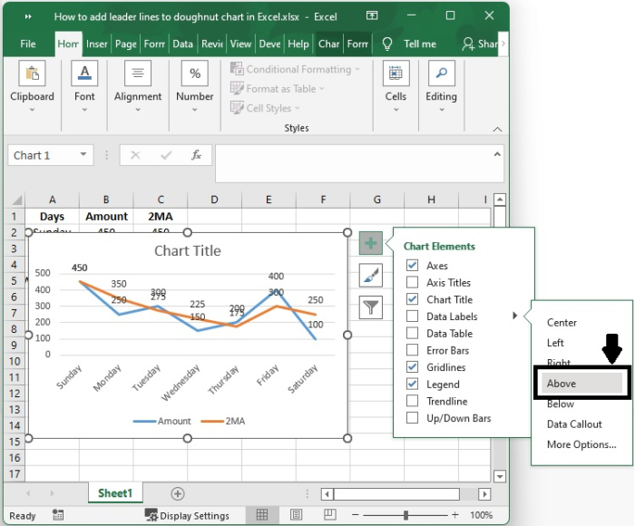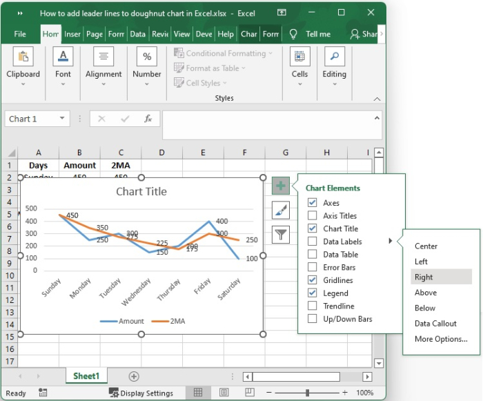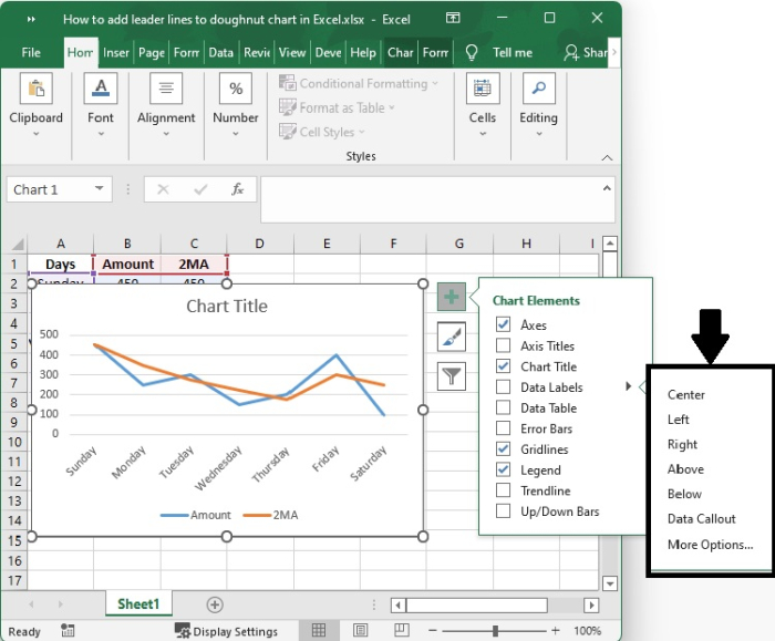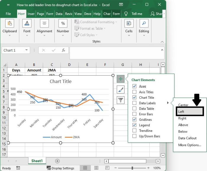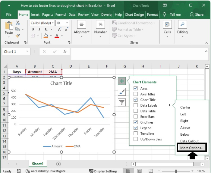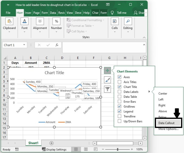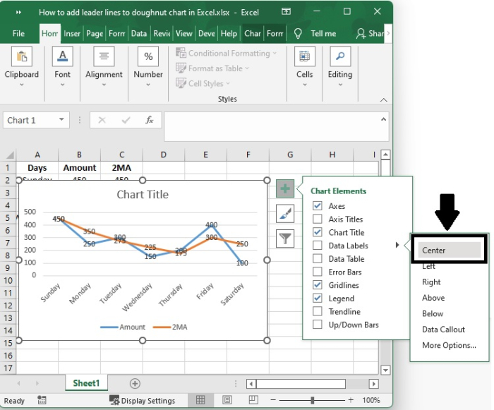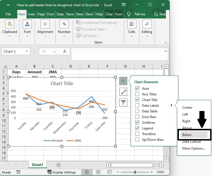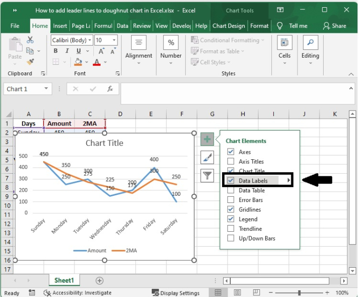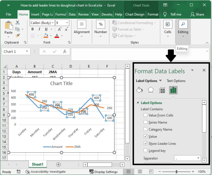 事實上,您無需執行任何特殊操作即可獲得引導線;當您向圖表新增資料標籤時,它們會自動顯示在圖表上。您可以透過簡單地將標籤拖放到圖表上來找到引導線。執行此操作後,您將看到標籤透過延伸到圖表上資料點的線與您的系列連線。