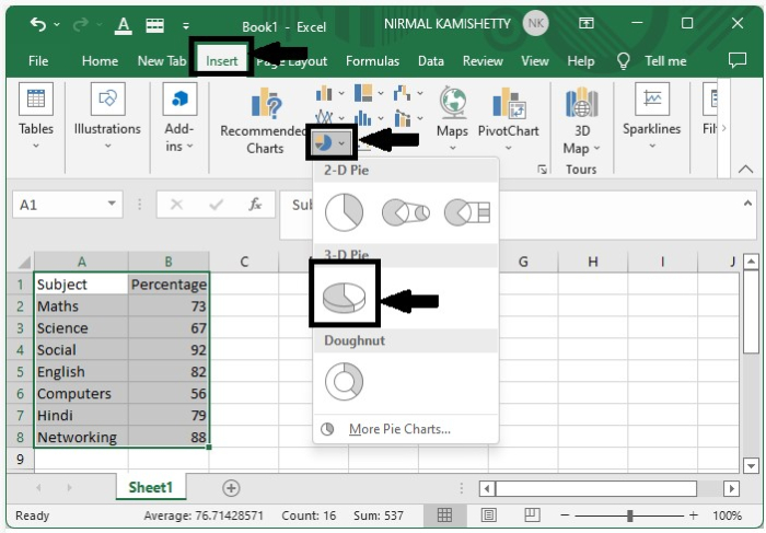 在圖表部分中選擇環形圖(名為“3D 餅圖”),然後選擇資料並複製。
