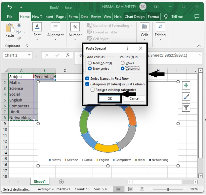 使用命令CTRL + C選擇資料並複製。單擊現有環形圖,然後在開始選單中的貼上選單中單擊“選擇性貼上”。