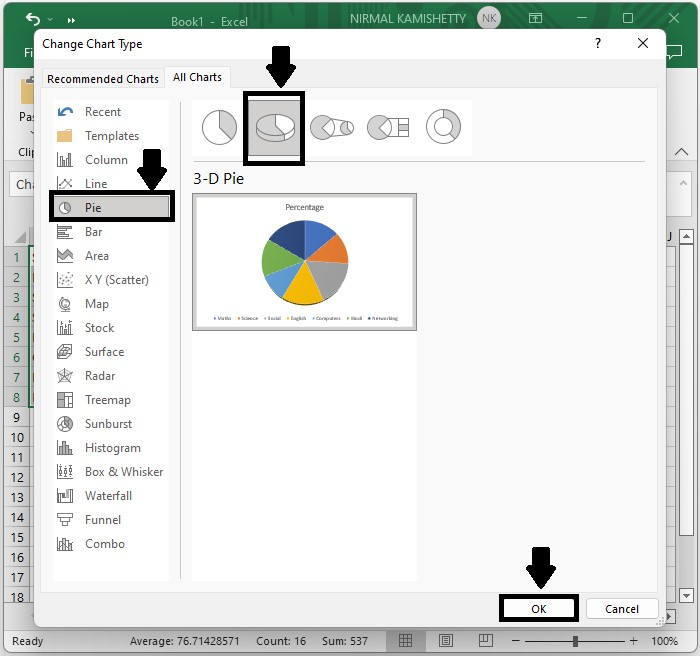 現在右鍵單擊圖表的外側,選擇“更改圖表型別”,然後在餅圖類別中選擇“3D 餅圖”,如下表所示。