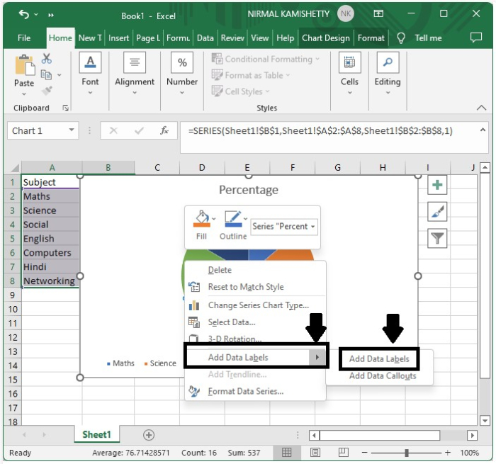 然後單擊餅圖,然後右鍵單擊並從內容選單中選擇“新增資料標籤”。