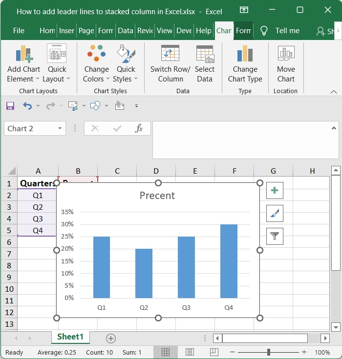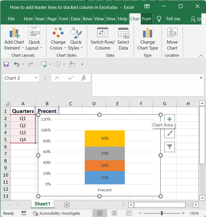 圖表中的資料標籤的使用使得理解顯示的資訊更加簡單,因為它們提供了關於顯示的資料點或資料系列的詳細資訊。不允許向堆疊柱形圖新增引導線;但是,存在可用於在具有堆疊柱形圖的Excel電子表格中顯示引導線的變通方法。
