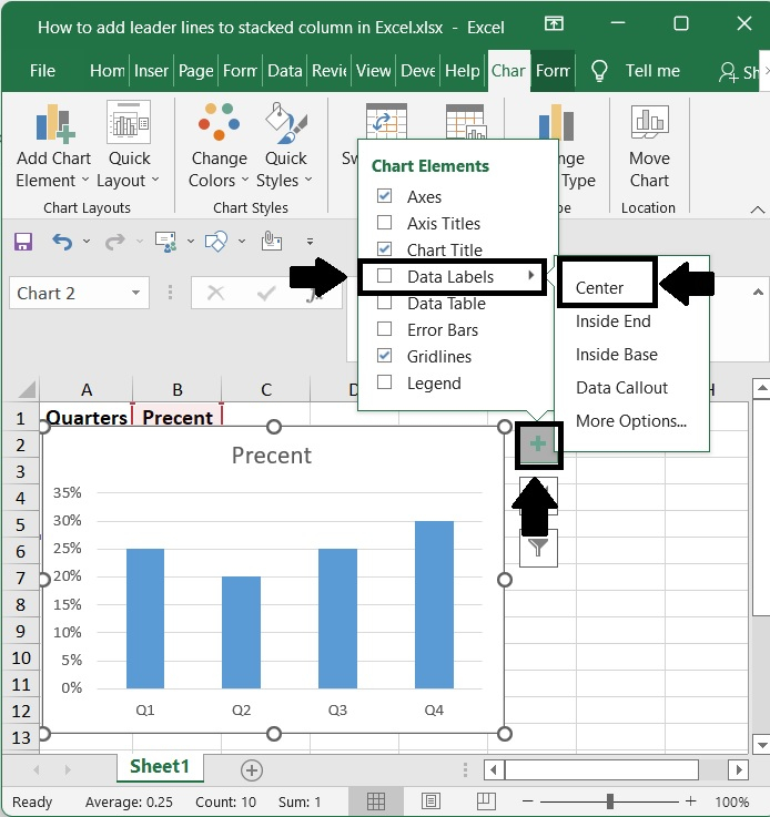 之後,從圖表元素的下拉選單中選擇“資料標籤”。然後,在此處選擇“居中”。