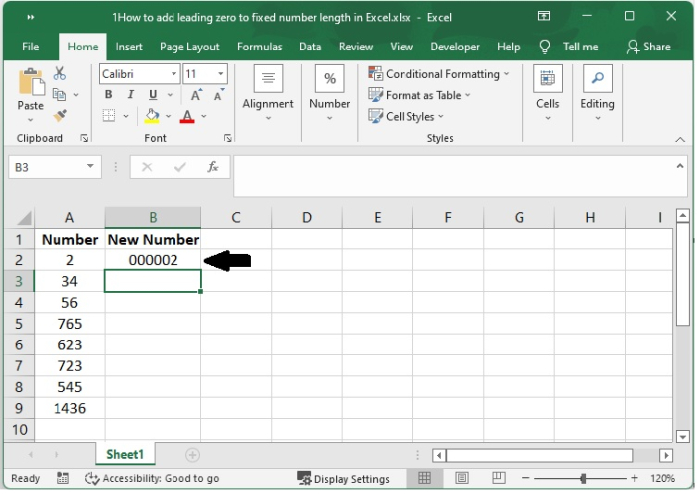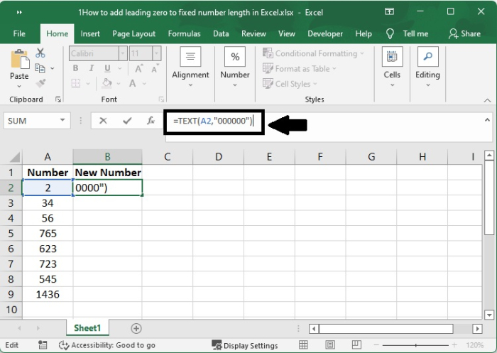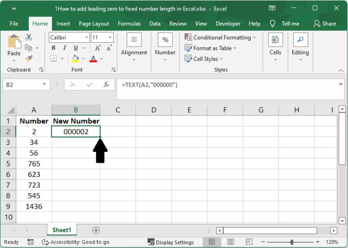您可以使用以下公式,為當前位於單元格 B2 中的數字新增零,以獲取最多 6 位數字的總數。