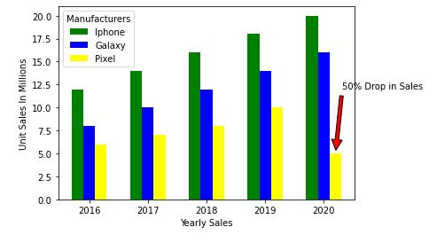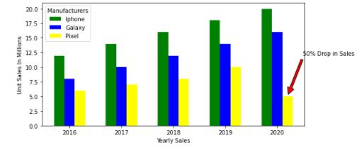使用 xy 和 xytext 屬性添加註釋。檢視資料,Google Pixel 手機銷量下降了 50%,即從 2019 年的 1000 萬臺下降到 2022 年的 500 萬臺。因此,我們將設定文字和註釋到我們的最後一個條形。