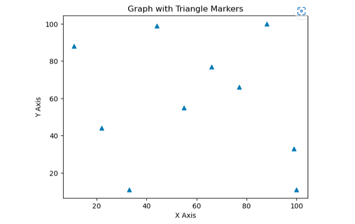 import matplotlib.pyplot as p # Create some sample data x = [11, 22, 33, 44, 55,66,77,88,99,100] y = [88, 44, 11, 99, 55,77,66,100,33,11] # Create a scatter plot with triangles as markers p.scatter(x, y, marker='^') # Add labels and title p.xlabel('X Axis') p.ylabel('Y Axis') p.title('Graph with Triangle Markers') # Show the plot p.show()