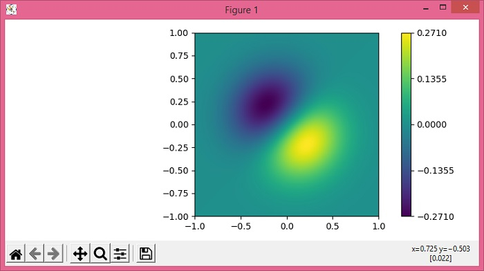 import numpy as np import matplotlib.pyplot as plt plt.rcParams["figure.figsize"] = [7.50, 3.50] plt.rcParams["figure.autolayout"] = True x, y = np.mgrid[-1:1:100j, -1:1:100j] z = (x + y) * np.exp(-5.0 * (x ** 2 + y ** 2)) plt.imshow(z, extent=[-1, 1, -1, 1]) ticks = np.linspace(z.min(), z.max(), 5, endpoint=True) cb = plt.colorbar(ticks=ticks) plt.show()