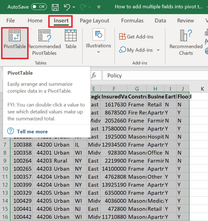現在,選擇資料範圍 A1:J19。點選工具欄功能區上的“插入”選項卡,然後選擇“資料透視表”選項以插入所選資料範圍的資料透視表。請參考下面的螢幕截圖。