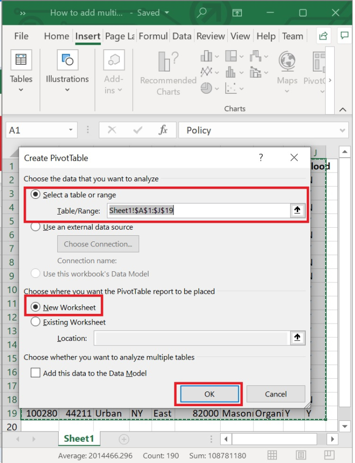 在下一步中,將出現“建立資料透視表”視窗,請確保在“選擇表格/範圍”選項下選擇了資料範圍 A1:J19。現在,選擇“新建工作表”以在單獨的工作表中建立資料透視表,然後單擊“確定”按鈕。