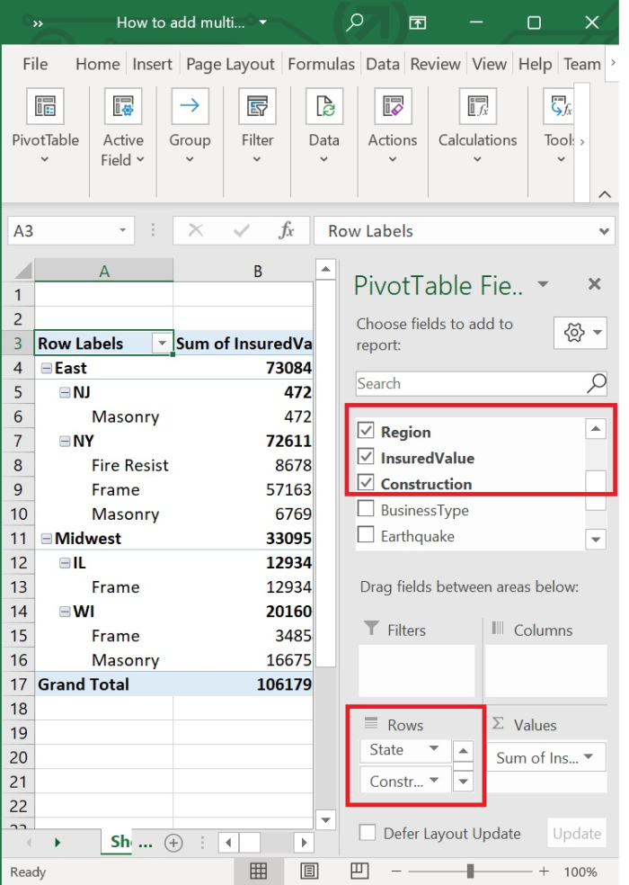 現在,單擊欄位名稱旁邊的複選框以建立多欄位級別的資料透視表。所選描述性欄位會自動新增到“行”類別下。我們也可以手動將欄位拖放到“行”類別下。下面的螢幕截圖顯示了此操作。