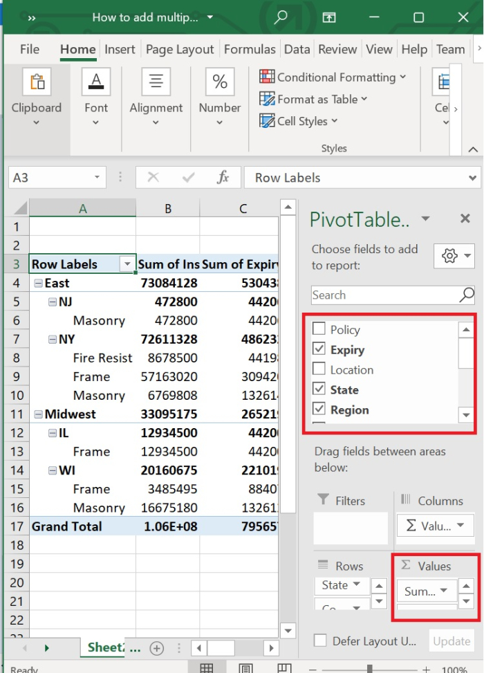 與上述多個行欄位類似,我們可以在資料透視表中新增多個值欄位。單擊值欄位旁邊的複選框或手動將欄位拖放到“值”類別下。請參考下面的螢幕截圖。