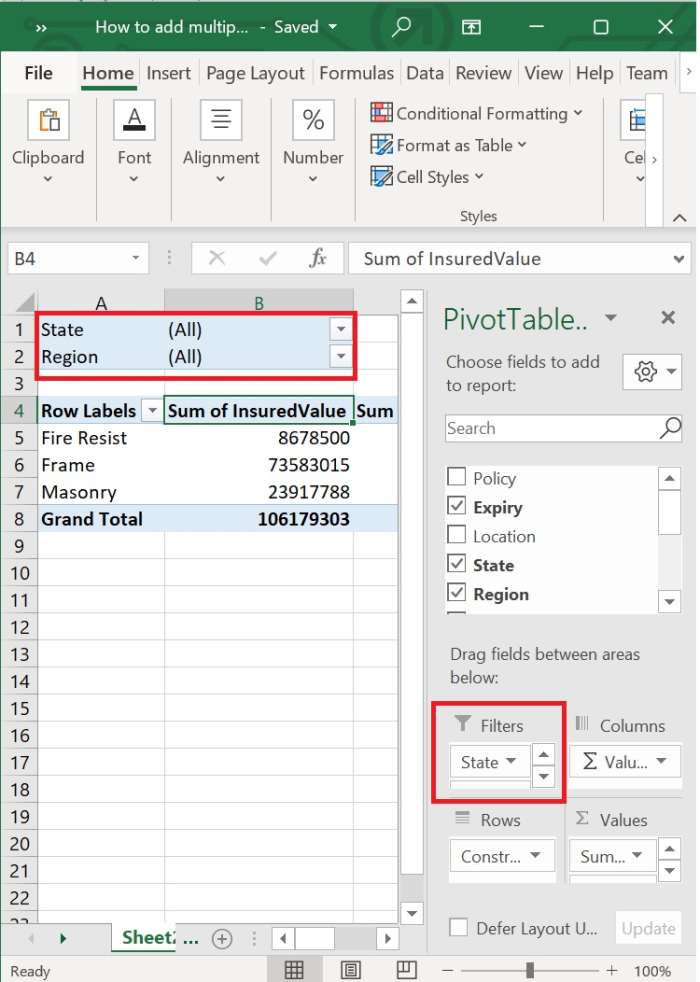 我們還可以將多個欄位新增到“篩選器”部分以篩選資料透視表。要實現此目的,請將欄位拖放到“篩選器”類別下。下面是此操作的螢幕截圖。