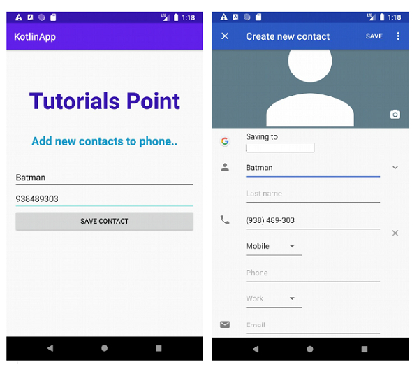 <?xml version="1.0" encoding="utf-8"?> <LinearLayout xmlns:android="http://schemas.android.com/apk/res/android" xmlns:tools="http://schemas.android.com/tools" android:layout_width="match_parent" android:layout_height="match_parent" android:orientation="vertical" android:padding="16dp" tools:context=".MainActivity"> <TextView android:layout_width="match_parent" android:layout_height="wrap_content" android:layout_marginTop="50dp" android:padding="8dp" ndroid:text="Tutorials Point" android:textAlignment="center" android:textColor="@color/colorPrimaryDark" android:textSize="48sp" android:textStyle="bold" /> <TextView android:layout_width="match_parent" android:layout_height="wrap_content" android:layout_marginTop="20dp" android:padding="8dp" android:text="Add new contacts to phone.." android:textAlignment="center" android:textColor="@android:color/holo_blue_dark" android:textSize="24sp" android:textStyle="bold" /> <EditText android:id="@+id/etName" android:layout_width="match_parent" android:layout_height="wrap_content" android:layout_marginTop="30dp" android:inputType="text" /> <EditText android:id="@+id/etNumber" android:layout_width="match_parent" android:layout_height="wrap_content" android:inputType="number" /> <Button android:id="@+id/buttonSave" android:layout_width="match_parent" android:layout_height="wrap_content" android:onClick="addContact" android:text="Save contact" /> </LinearLayout>