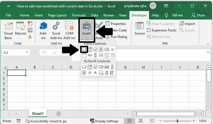 透過在“開發工具”選項卡中選擇“插入”選項並單擊它來建立按鈕。