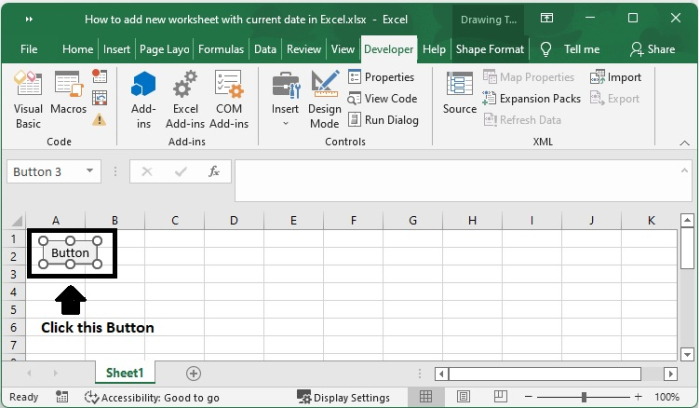 Sub AddAndNameWithCurrentDate() 'Step 1: Tell Excel what to do in the event of an error. On Error GoTo Error 'Step 2: Create a new worksheet and give it a name that is easily identifiable. Sheets.Add 'Create a new worksheet, and the name of the sheet will be Sheet1 by default. ActiveSheet.Name = Format(Date, "dd-mm-yyyy") 'name with the current date, this row may be deleted if all you want to do is add another sheet. Exit Sub 'Step 3: If there was a problem here, the user should be informed. Error: MsgBox "That is the name of an existing Worksheet in the spreadsheet." End Sub