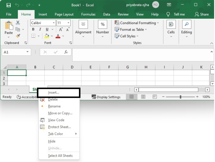 您可能會遇到需要將其他工作表附加到現有工作表側面的情況。Excel 工作簿是儲存在一個位置的一組 Excel 工作表。右鍵單擊底部工作表跟蹤托盤中的工作表名稱,即可將新的工作表插入文件中。這在下面的影像中顯示。