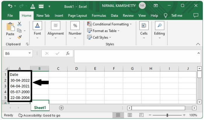 讓我們建立一個 Excel 表格,其中包含一列包含日期列表。