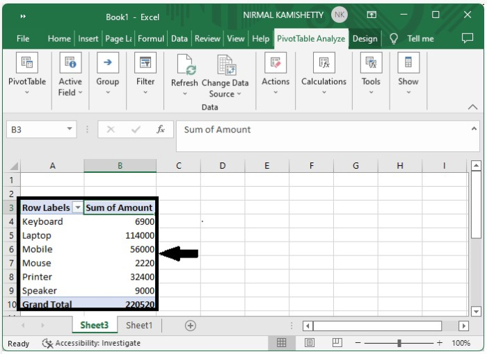 要建立資料透視表,請選擇“資料”,然後在“插入”下選擇“資料透視表”,資料透視表將成功建立,如下面的影像所示。為“專案”和“金額”建立資料透視表。