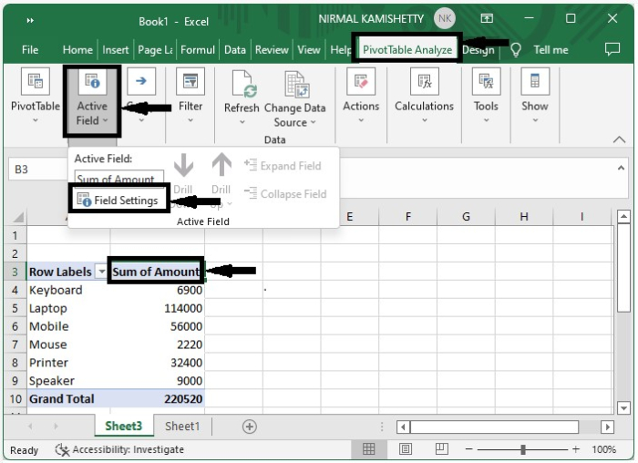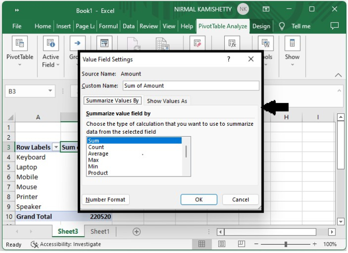 現在單擊“金額之和”,然後在“資料透視表分析”下的“活動欄位”下單擊“欄位設定”,然後將開啟一個新的彈出視窗,如下面的影像所示: