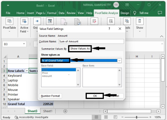 現在單擊“顯示值”,然後從“顯示值方式”的下拉列表中選擇“% of grand total”,最後單擊“確定”。