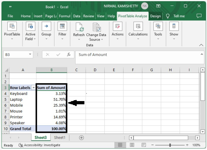 我們還可以將名稱更改為金額百分比,如果您想保留之前的列,只需在資料透視表中複製該列即可。