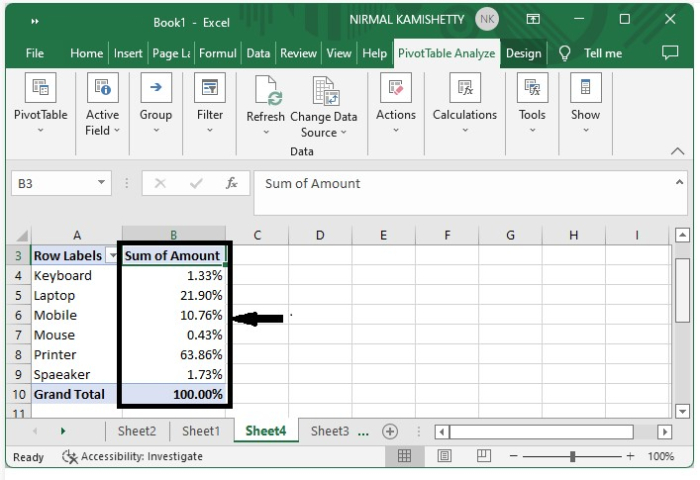 讓我們看看在 Excel 資料透視表中新增總計列百分比列的簡單過程: