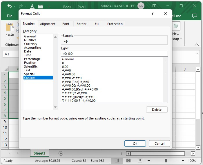 接下來,單擊“自定義”選項並將“型別”輸入為“+0;-0;0”,如下圖所示。此公式將在正數前新增 (+) 號,在負數前新增 (–) 號,在零前不新增任何符號。