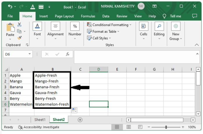 讓我們考慮上面示例中使用的相同資料。要新增字尾,請單擊一個空單元格並輸入公式 =CONCATENATE(A1,"-Fresh") 並按 Enter 鍵以獲取第一個結果。