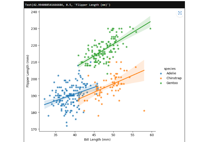 在散點圖中,我們將使用 lmplot() 函式為每個組添加回歸線。