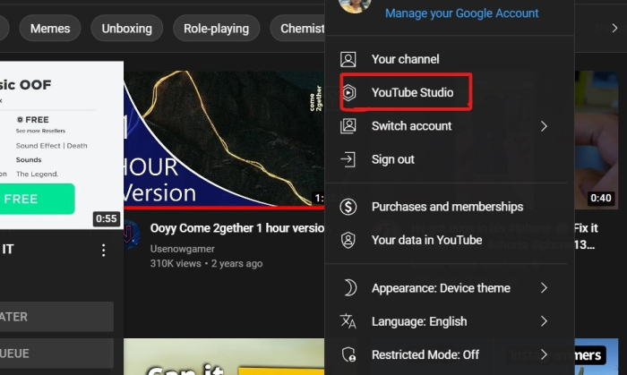 在 YouTube 螢幕上,點選右上角的個人資料圖片,然後開啟 YouTube 工作室。