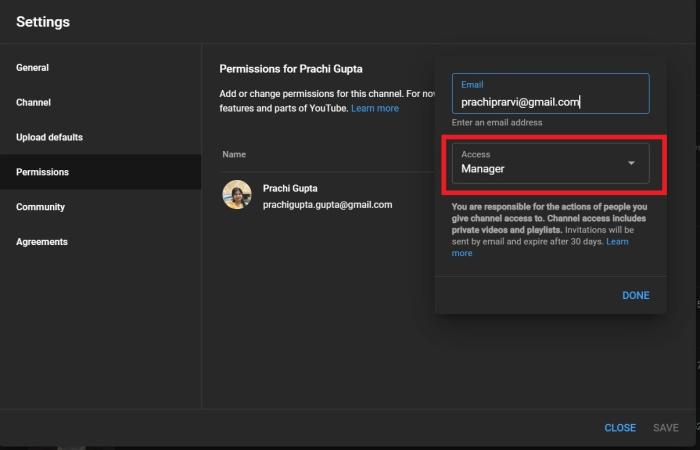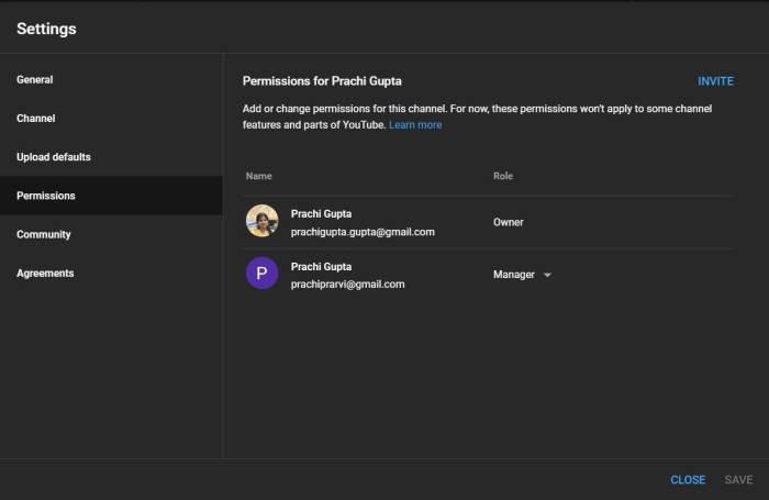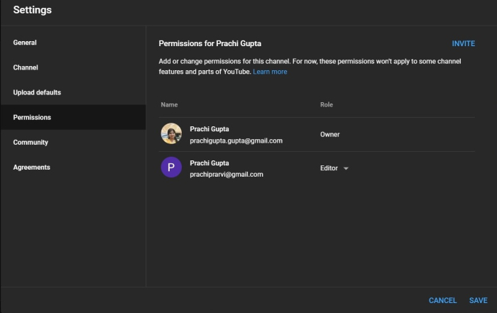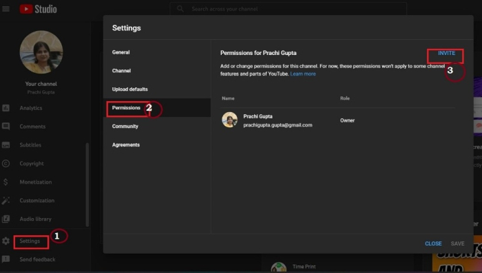 在 YouTube 工作室螢幕上,點選左下角的設定按鈕。您可以在左側看到一個許可權選項卡。點選它,它將顯示誰有權訪問 YouTube 頻道。要邀請新的管理員,請點選螢幕右上角的邀請按鈕,然後輸入要邀請的人員的電子郵件地址以管理頻道。