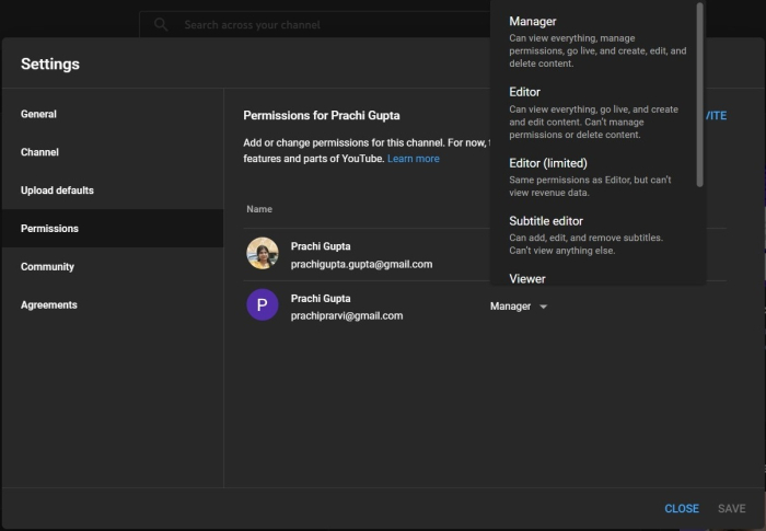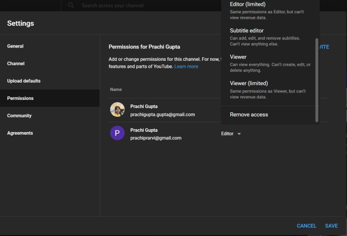 可以透過許可權向一個人分配五種不同的角色。這些角色分別是管理員、有限編輯、編輯、檢視者和有限檢視者。有幾種不同的方法可以授予某人訪問 YouTube 頻道的許可權,但這都取決於您擁有的頻道型別。頻道有兩種型別:個人 YouTube 頻道和品牌帳戶。讓我們首先討論個人頻道。