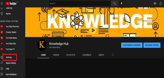 我們將開啟 YouTube 工作室。但是,當開啟設定時,右側沒有許可權選項卡。轉到設定選項卡,然後