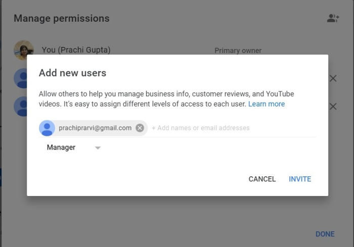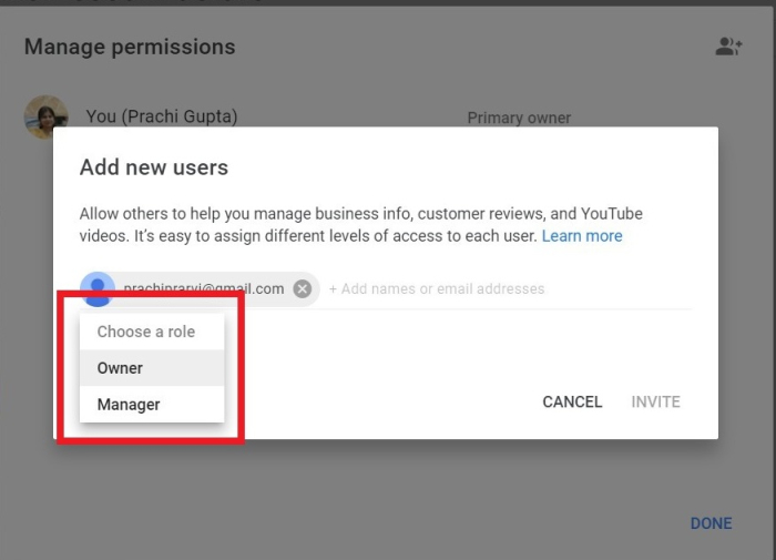 完成人員及其角色的選擇後,點選完成,受邀者將收到一封電子郵件,可以在 30 天內接受該電子郵件以成為 YouTube 頻道的管理員。