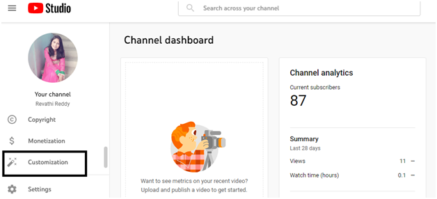 - 步驟3 − 點選YouTube Studio後,您將被重定向到此頁面(如下圖所示)。向下滾動,在左側選單中,您將找到自定義選項卡,然後點選自定義。