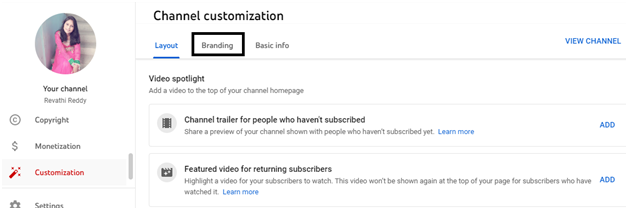 - 步驟4 − 將開啟頻道自定義頁面,您會發現三個選項卡 – 佈局、品牌和基本資訊。點選品牌選項卡。