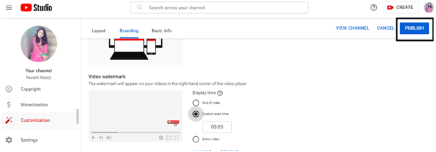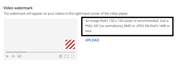 - 步驟6 − 向下滾動,您會找到影片水印部分,在這裡您可以上傳訂閱按鈕。