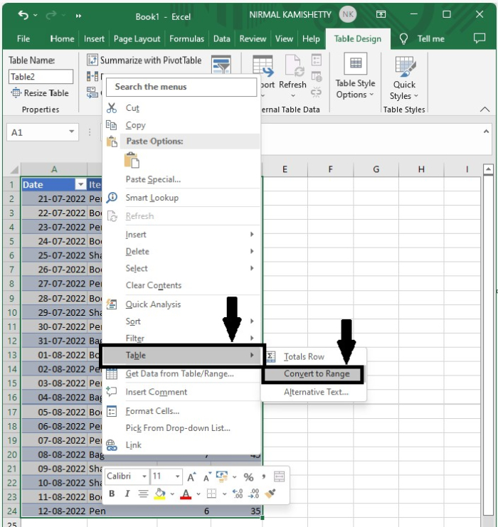 右鍵單擊屬於表格的任何單元格以獲取選單,單擊“表格”,然後單擊“轉換為區域”。