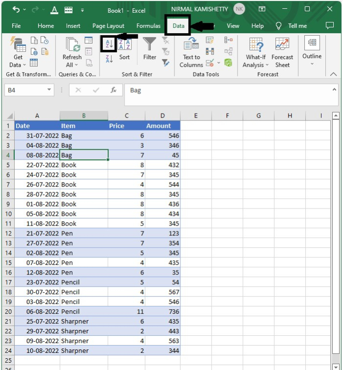 現在,單擊“資料”以對要新增小計的行中的某個單元格進行排序。