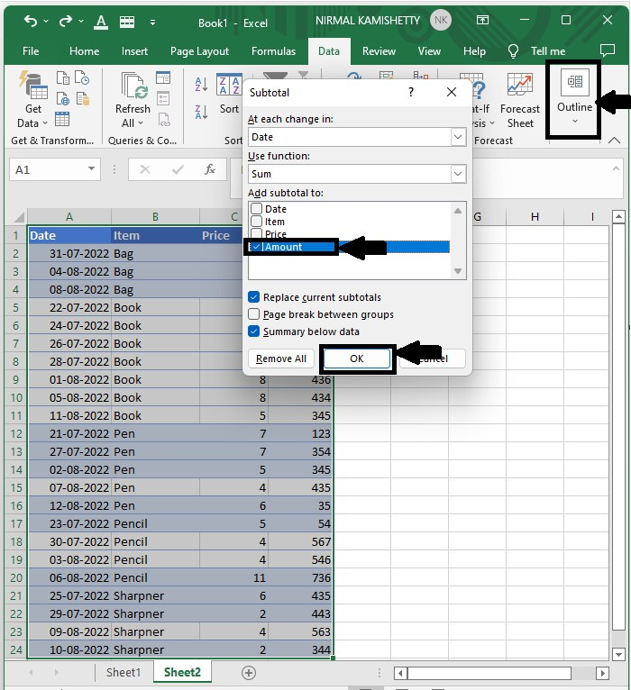 現在,單擊“資料”選單下“大綱”部分中的“小計”,將顯示一個選單,如下圖所示。