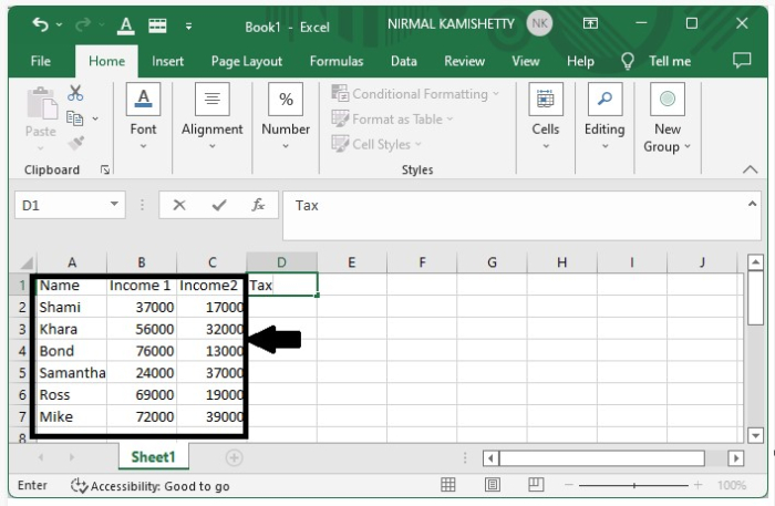 讓我們假設我們在 Excel 中有一張表格,顯示了六個人的多個收入來源的詳細資訊