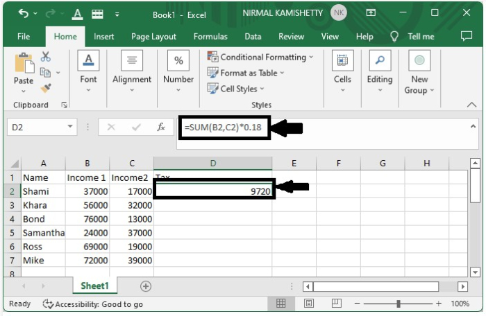 現在單擊一個空單元格並輸入公式=SUM(B2, C2) *0.18(以我們的示例為例)。按下“Enter”鍵以獲得第一個結果,如下面的螢幕截圖所示