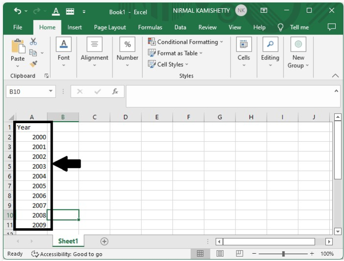 開啟一個Excel工作表,並在某一列中插入一些虛擬資料,如下所示: