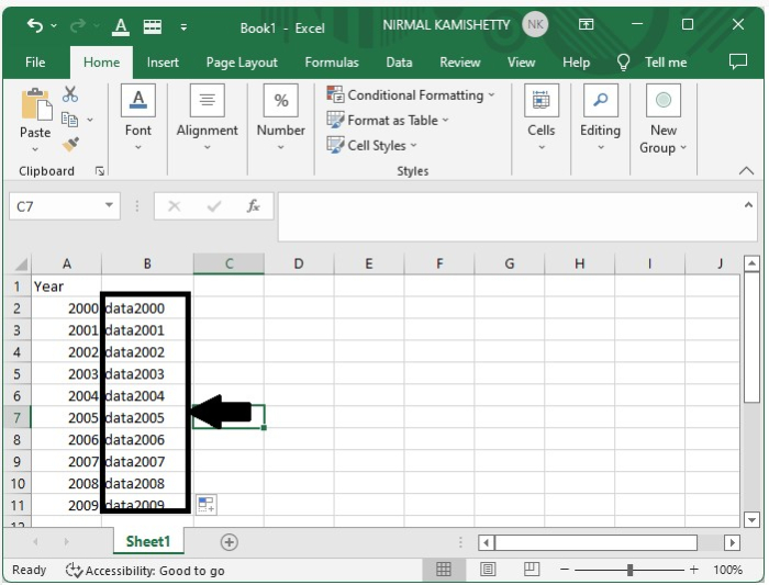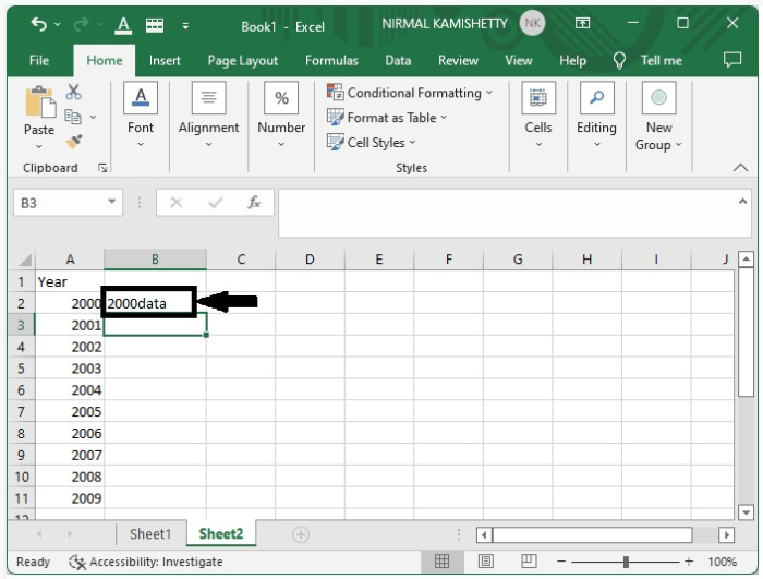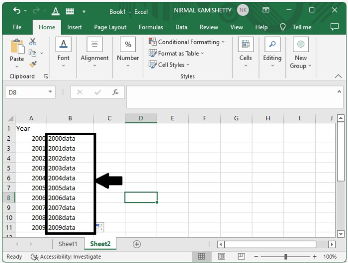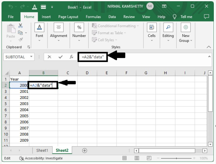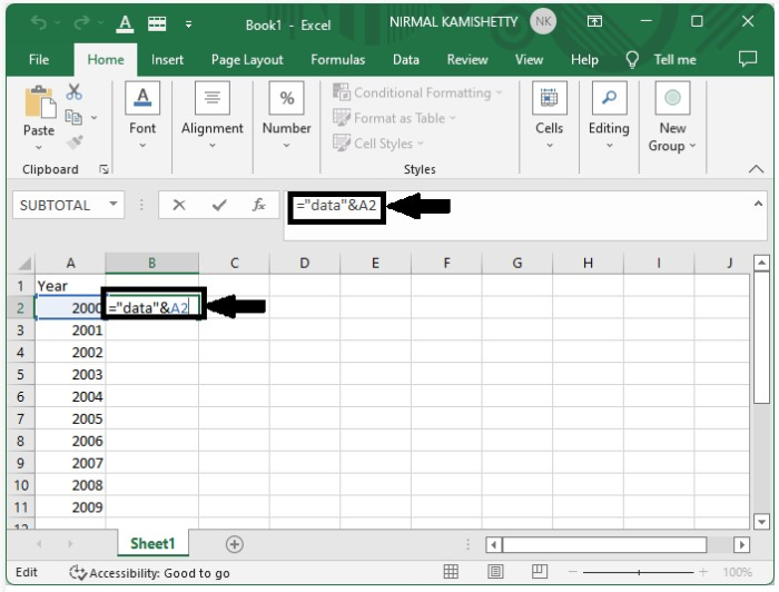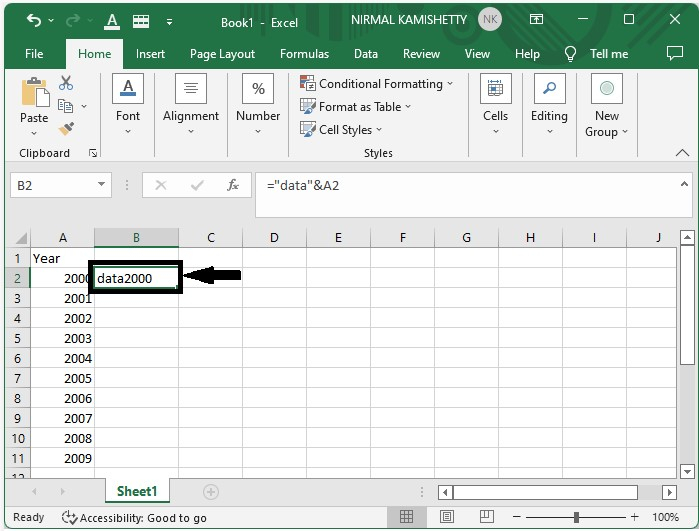 選擇要顯示第一個結果的單元格,然後在公式框中輸入公式="data"&A2。在這裡,我們在單元格的開頭添加了文字“data”。