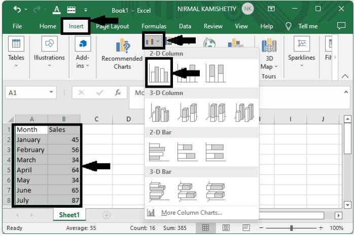 要建立條形圖,請選擇資料,然後從“插入”選單下的“圖表”部分選擇“二維條形圖”,如下圖所示: