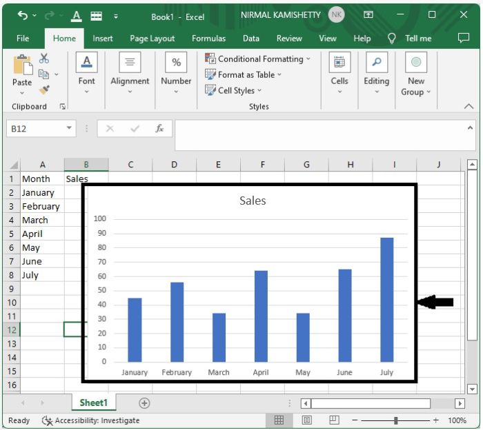 在這裡,我們將首先從給定的一組資料建立一個條形圖,然後在圖表中插入一個文字框以突出顯示最高的銷售額。