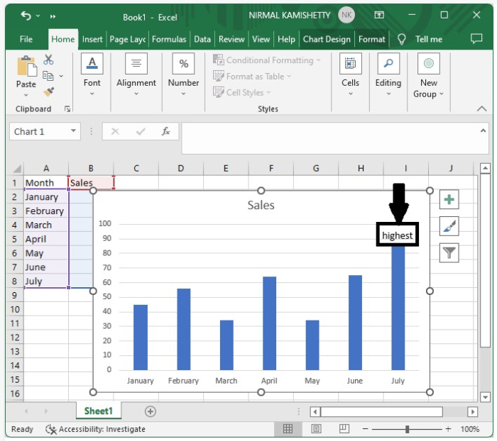 建立文字框後,向其中新增一些文字(在本例中,我們在文字框中使用了標籤“最高”),然後您可以移動文字框,並將其精確地放置在最高的條形上方以突出顯示最高的銷售額。