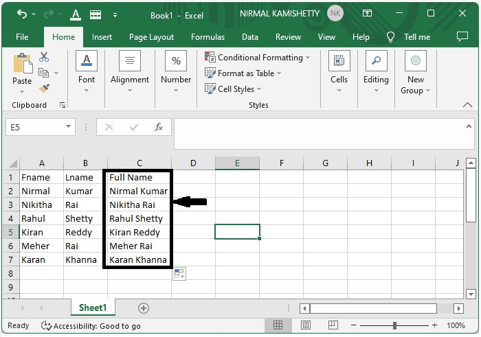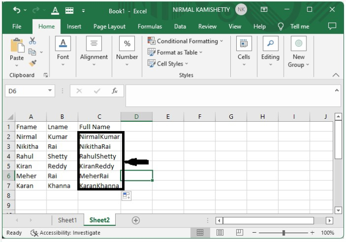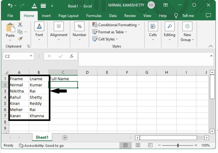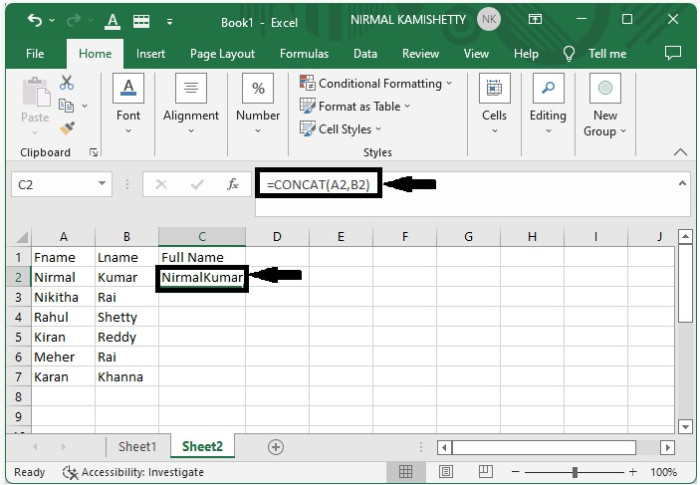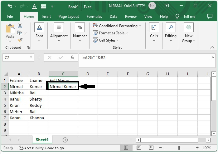 在我們的例子中,它將在單擊文字單元格“C2”後的公式框中為(=A2&" "&B2)。